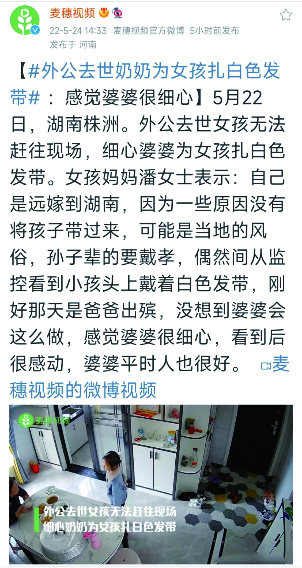 5月22日,湖南株洲。外公去世女孩无法赶往现场,细心婆婆为女孩扎白色发带。女孩妈妈潘女士表示:自己是远嫁到湖南,因为一些原因没有将孩子带过来,可能是当地的风俗,孙子辈的要戴孝,偶然间从监控看到小孩头上戴着白色发带,刚好那天是爸爸出殡,没想到婆婆会这么做,感觉婆婆很细心,看到后很感动,婆婆平时人也很好。 许多网友对婆婆的行为表示肯定,“太感动了,这样的婆婆太好了”,“太喜欢这种家庭了”,“非常温暖的画面,真的是很温馨,被感动到了”,“真的不错,非常细心的婆婆呢”……