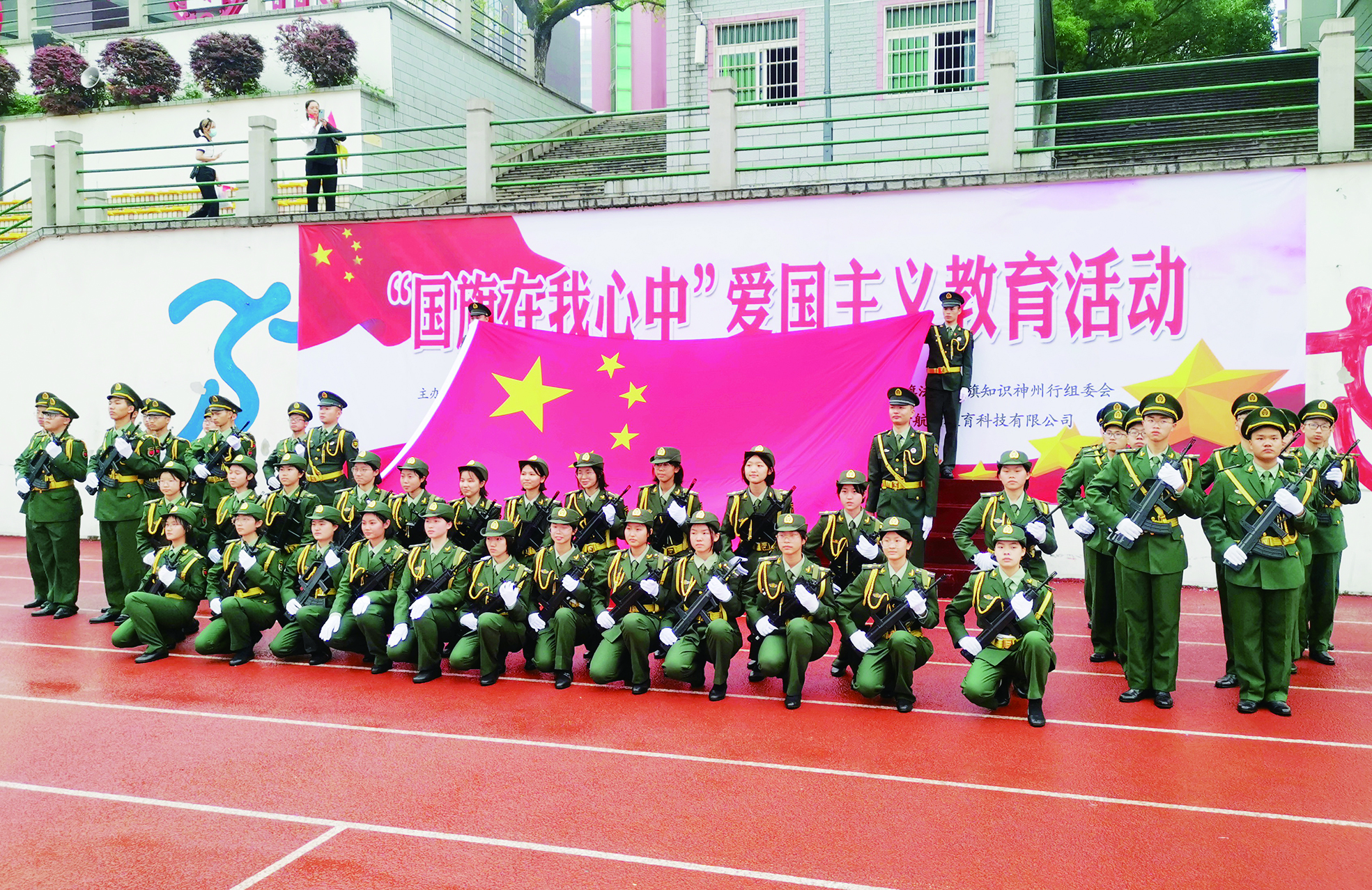 ▲市一中国防班的同学们与国旗“同框”。 记者/戴凛 摄