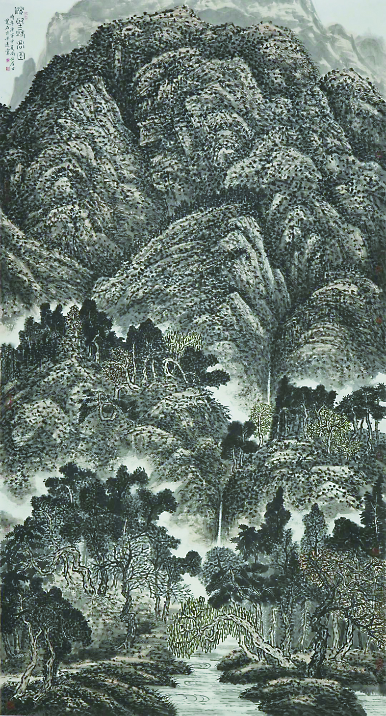 画为花鸟和山水。花鸟皆是大写意梅花,下笔沉雄痛快,干、枝、杈、花,交错呼应,疏密互衬,或水墨,或施色,显示出一种阔大的境界与气势,有视觉的冲击力。加上题诗题词的隽雅、书法的俊逸,确为佳品。山水画中,隆重推出的是他画株洲炎陵县——炎帝的归寝之地的“炎陵山水画”系列,让人最为心动。这些山水画,尺幅各异,画法各有偏重,或工或写,或工写相兼。构图多用高远法,以表现山的伟岸、峻险;而且是满构图式,山峰、丘壑、树木、芳草、溪瀑、亭台、云雾、苔点,大处气象雄浑、阔大、华润,小处亦小心收拾,光影灵动。在用墨用色上,块线互映,浓、淡、干、涩自见,将宋元及当代山水前贤的各种画法,择优而施,并从中流淌出丰盈的文化信息、哲理思辩,可久看久品而意味深长。他对大家张汀的焦墨技法尤有体会,勾、皴、擦、点,十分圆熟,同时又有变通,或焦墨加积,或辅以淡色晕染,于厚重、凌厉中见明润、华滋,如《炎陵山居图》《春山烟霭》《嘉木繁阴》等幅皆是。