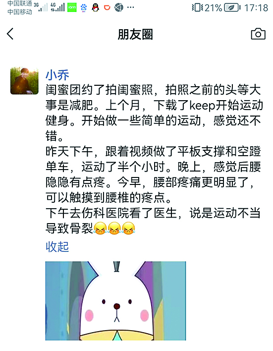 夏天来了,身边许多朋友都在一个劲地健身减肥,本期话题想和大家聊一聊“运动损伤”。前几天,朋友小乔发圈说,为了拍闺蜜照,她决定健身减肥,跟着Keep做平板支撑和踩单车, 结果因为运动不当导致腰部骨裂,进了医院,健身变成了“伤身”。