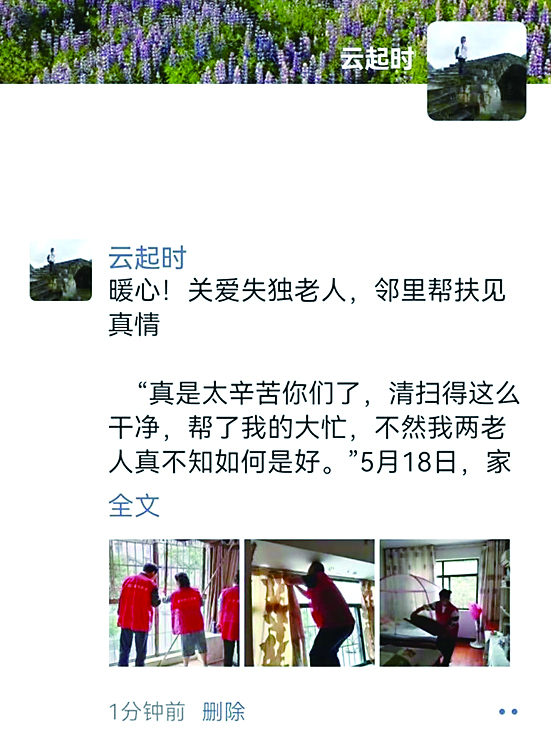 小区居民康彬彬得知了老人的烦心事后,她立即在小区业主微信群里发出为老人清洁房间的倡议,得到了居民的热烈响应。没多久,几位小区志愿者便在老人家里忙开了,擦窗户、洗窗帘、清洁厨房……大家忙活一上午后,让老人家里焕然一新,二老露出了久违的笑容。