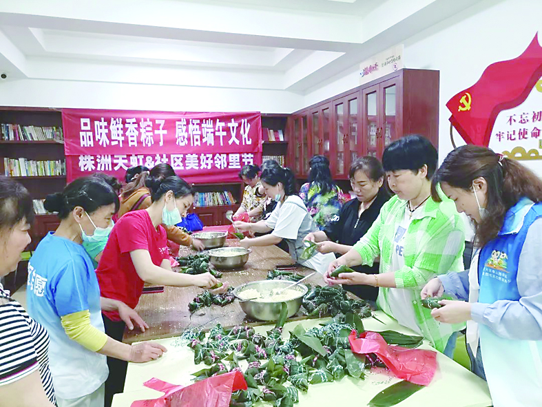 ·“品味鲜香粽子,感悟端午文化”。5月31日上午,张家园社区携手天元区新城社会工作服务中心、株洲天虹超市,在社区活动室开展了“社区美好邻里节”包粽子活动,天虹超市提前准备好了糯米、枣、粽叶、线绳等,20多名社区居民和志愿者一起,你追我赶,两小时包了300多个粽子。