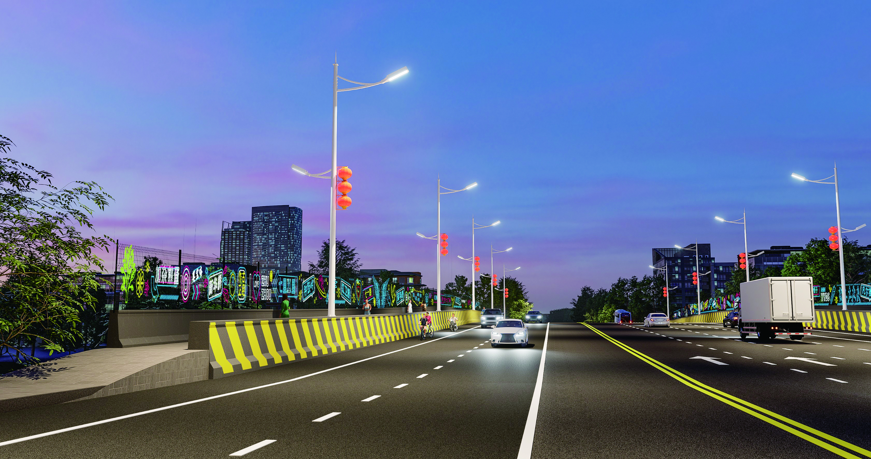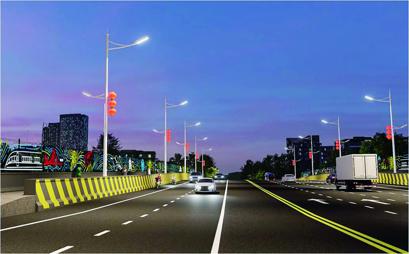 以桥体两侧护栏为载体,运用霓虹发光字“培育制造名城 建设幸福株洲”“打造‘三个高地’ 践行‘四新’使命”等标语,营造主题明确的城市氛围。