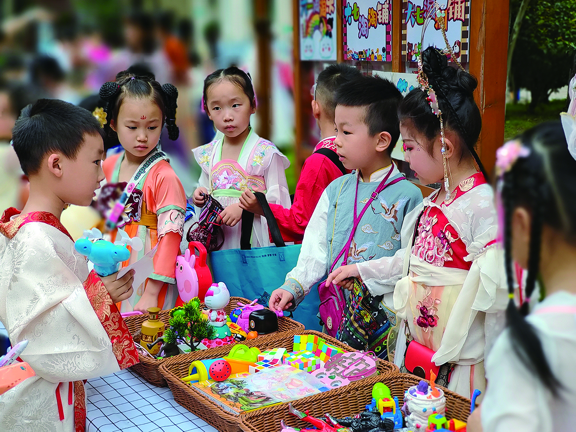 6月1日,市幼儿园举行一场专属于孩子们的盛大庆祝活动。幼师和孩子们身穿汉服,穿梭在“百变集市”的小吃街、民间游戏场、创意吧,用自己通过劳动赚来的“淘币”选择爱吃的美食、玩自己喜欢的游戏、淘自己中意的宝贝。