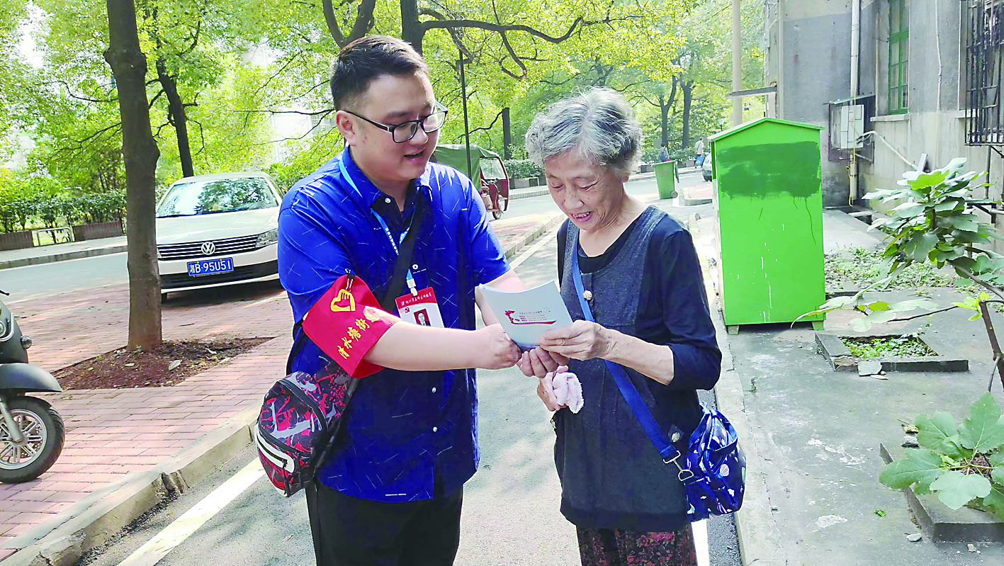 ▲谢玄砂帮助小区居民了解便民政策。记者/周蒿 摄