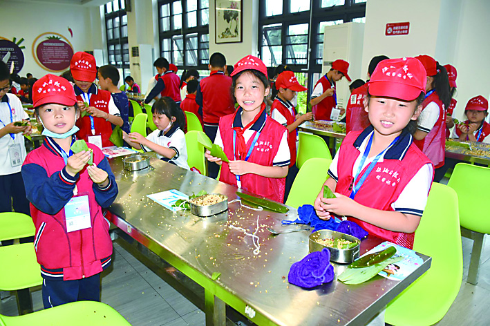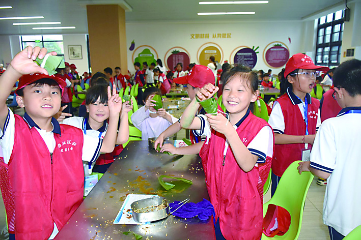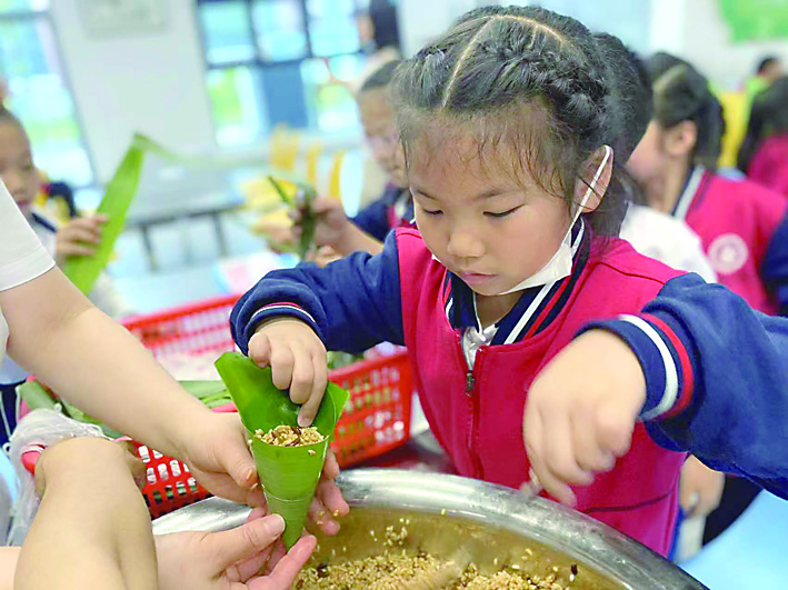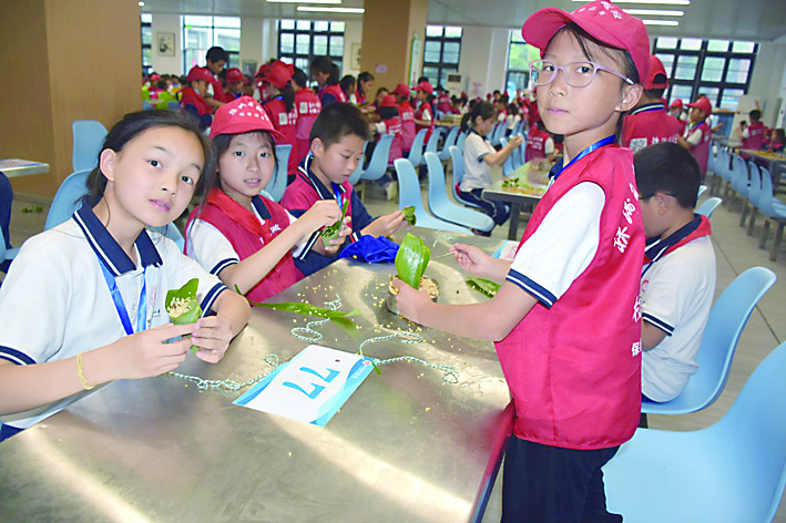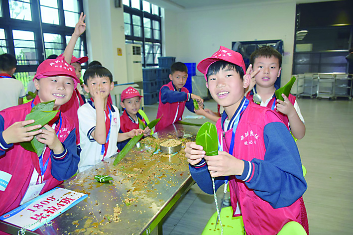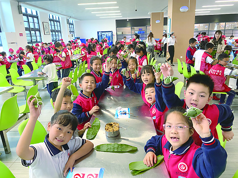 班队活动课知端午:老师组织学生学习交流有关端午的由来、习俗、诗词;升旗仪式展端午:快板、情景表演说端午,展示学生绘画手工作品;活动体验过端午:充分利用食堂等场地组织学生现场包粽子。鼓励家长带领学生在家包粽子、做香囊,插艾叶。课前查找资料,课上交流分享,课后实践操作,学练结合,知行合一,让学生在趣味学习实践中回望先祖,铭记传统,弘扬精神。