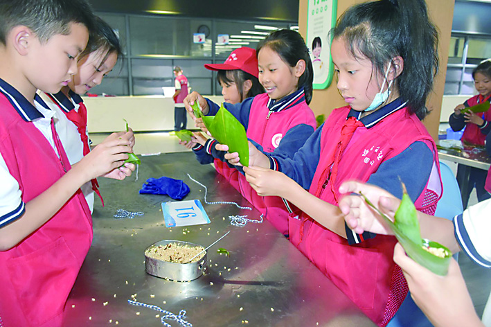 “啊!我的漏了!” “你看我包的,厉害吧!”“天哪,这也太难了吧?”食堂中传出来声声叹息和抱怨的同时,也伴随着阵阵欢声笑语。这是怎么回事呢?原来今天是我们校园记者开展的包粽子活动。