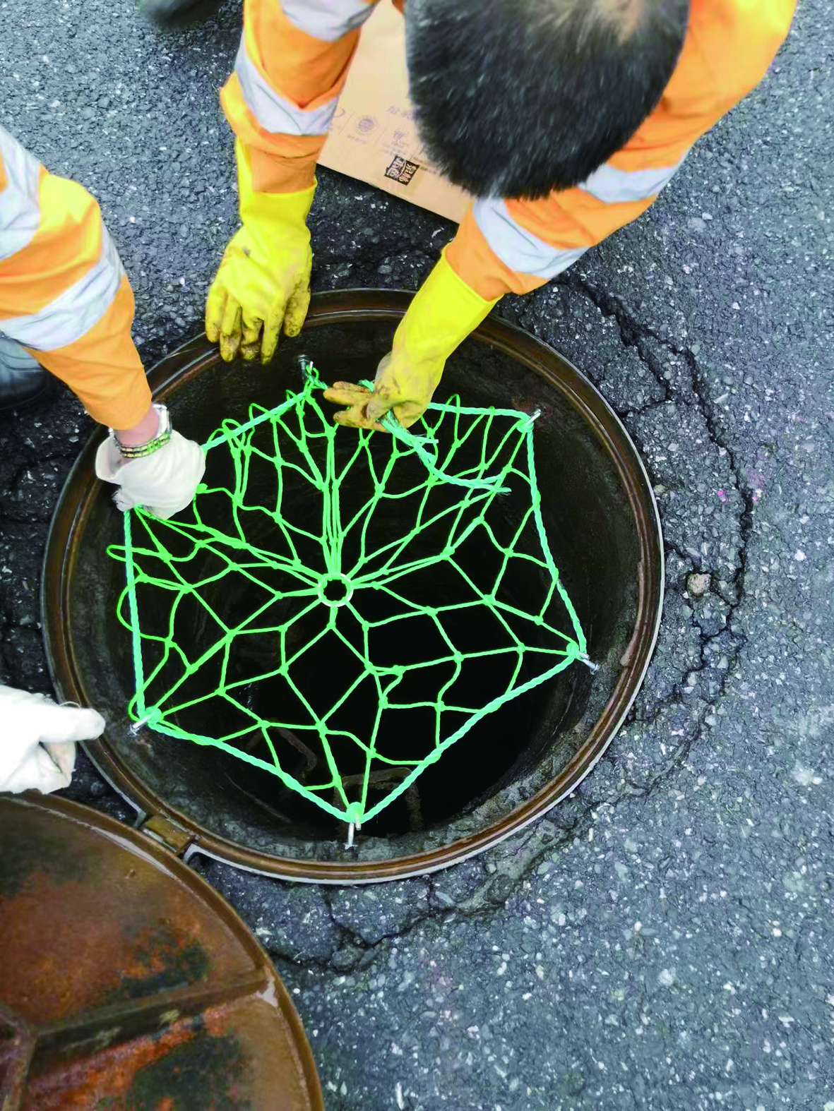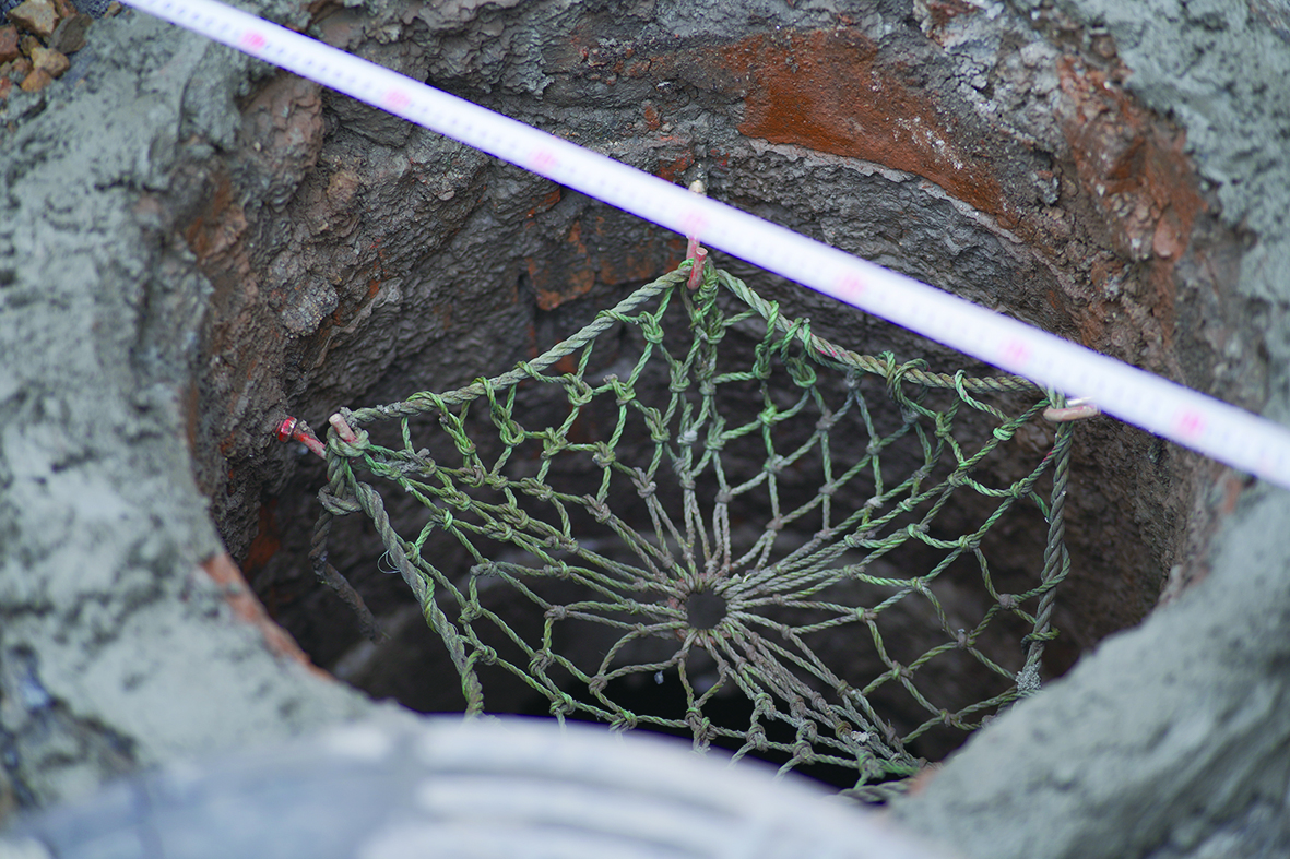 打开一处窨井盖,一个绿色的防坠网映入眼帘。这个防坠网由新型尼龙材料制成,安装在距井口约15厘米的位置,由6个螺栓固定在井筒壁上,一个防坠网的承重能力最高可达200公斤。