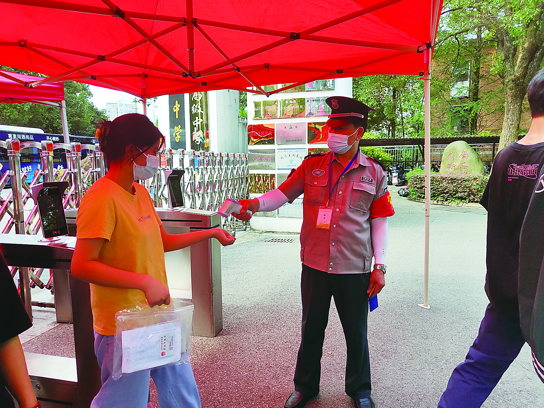 ▲昨日下午,在九方中学考点,工作人员对前来踩点的考生现场测温。 株洲晚报融媒体记者/孙晓静 通讯员/李璐 摄