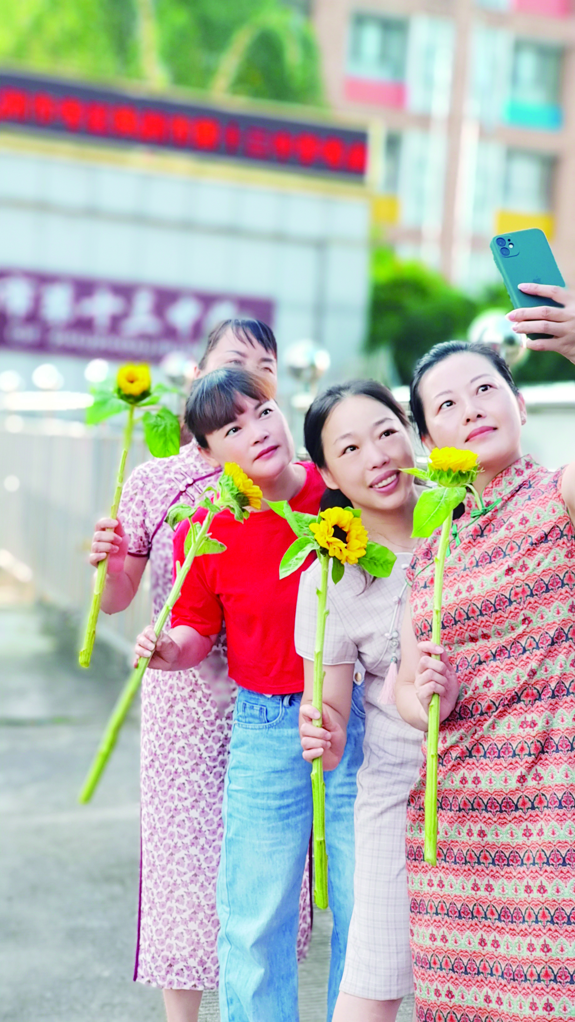在市二中、市十三中、市八中等考点外,记者注意到,现场不少家长驻足等候,满怀期盼。为了讨个好彩头,有家长手举向日葵,希望孩子一举夺魁。在送考老师和家长群体中,红衣、旗袍已成为“标配”,祝愿考生开门红、旗开得胜。