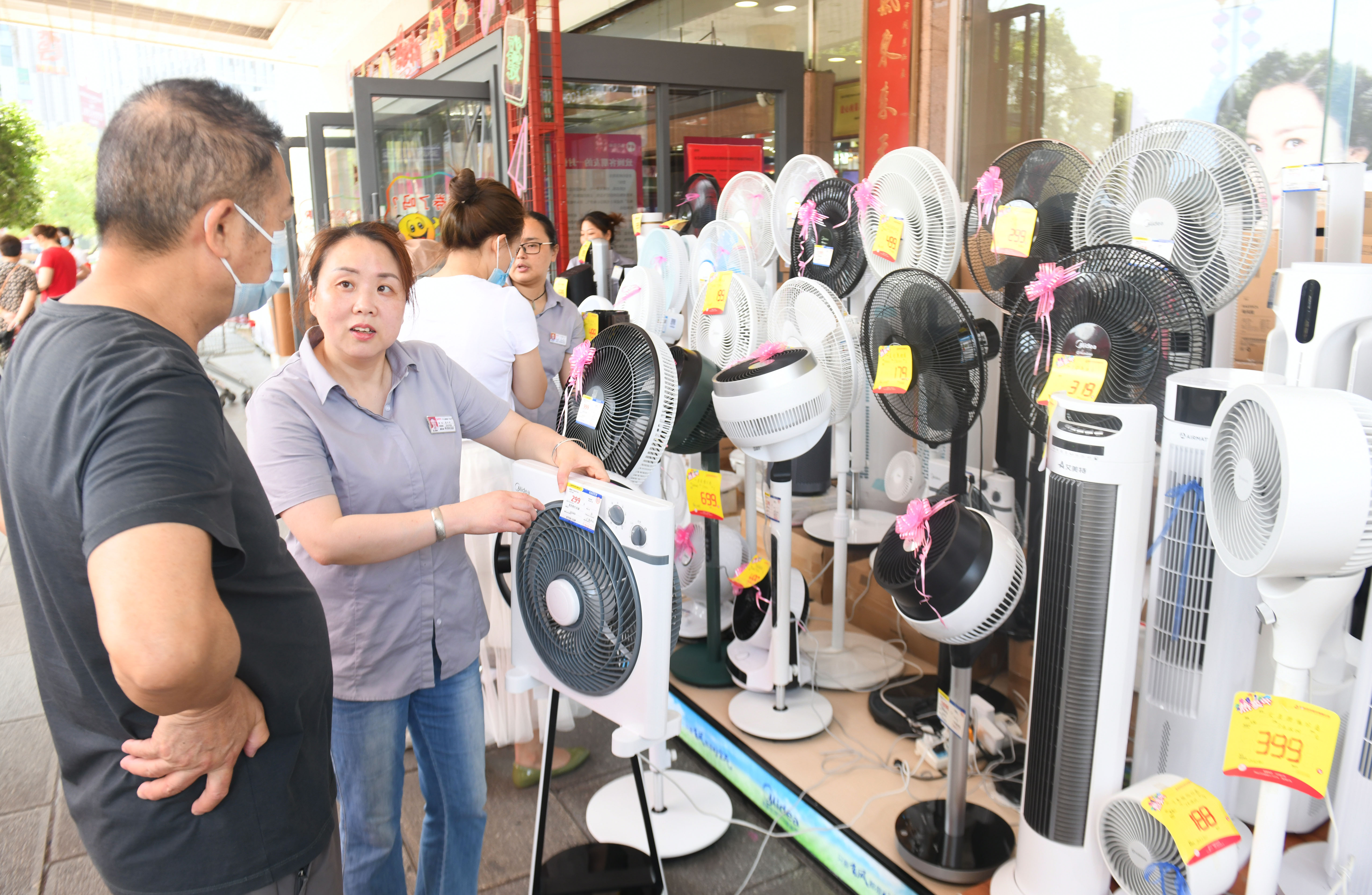 近日,随着气温持续走高,空调、电风扇等能够带来清凉的家电热卖。6月7日,天元区一商场门口摆满了各型号产品,前来选购的市民络绎不绝。