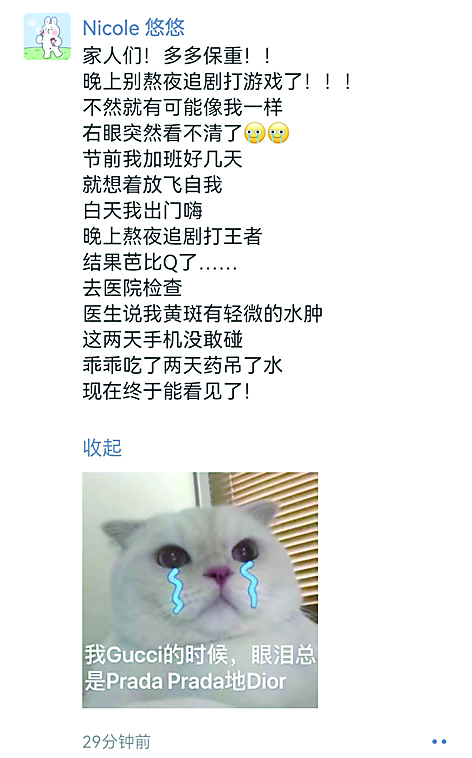 本期话题想和大家聊一聊“心灵的窗户”——眼睛。昨天,朋友悠悠发圈说,前段时间连着加班好几天,好不容易遇上小长假,她决定“放飞自我”,熬夜追剧、打游戏,结果因用眼过度导致右眼病变,吃了两天药还吊了水,这才恢复了视力。