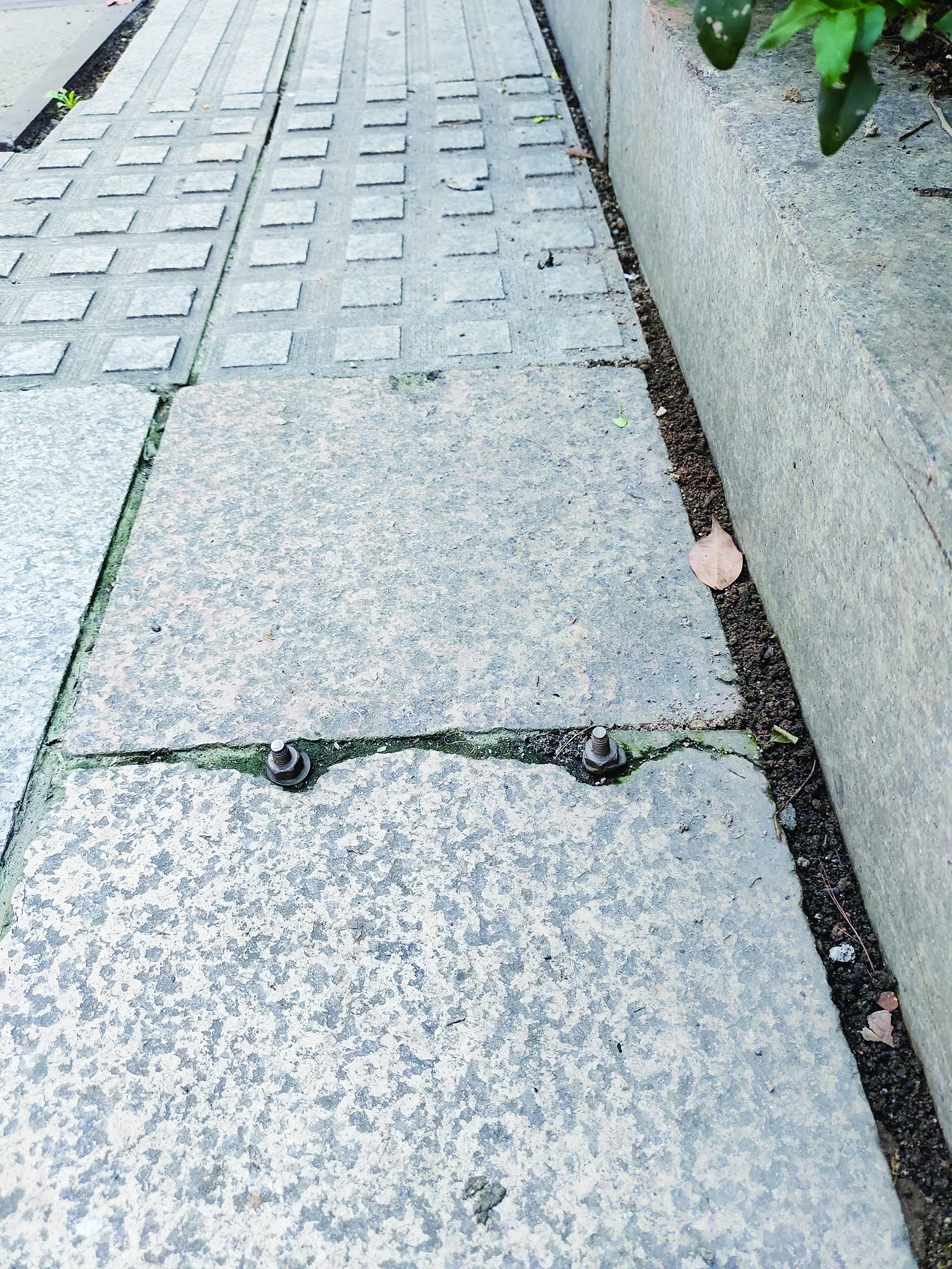 ▶人行道上的螺丝钉,存在安全隐患。陈开尧供图