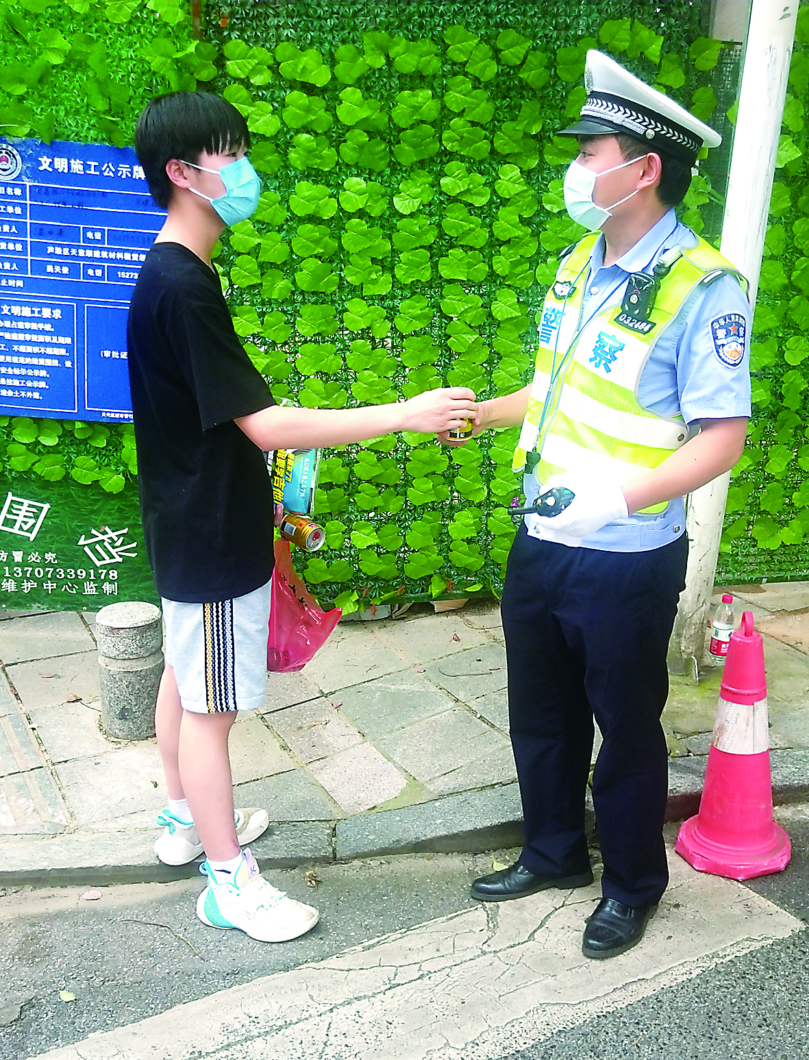“谢谢交警叔叔帮忙,请喝点东西解解渴!”6月9日中午,在芦淞区贺嘉路八中高考考点外,一名身穿黑色T恤衫的男学生将一罐饮料递给考点外执勤的芦淞交警。