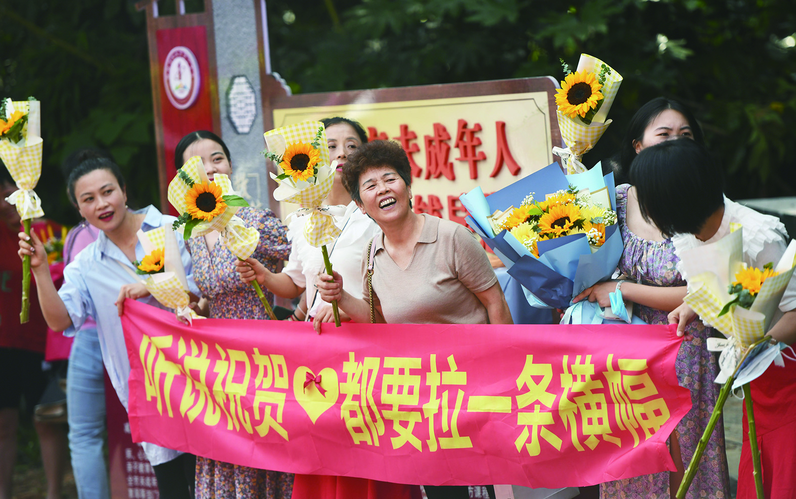 ▲市一中考点外,家长拉着横幅翘首盼望。记者/谢慧 摄