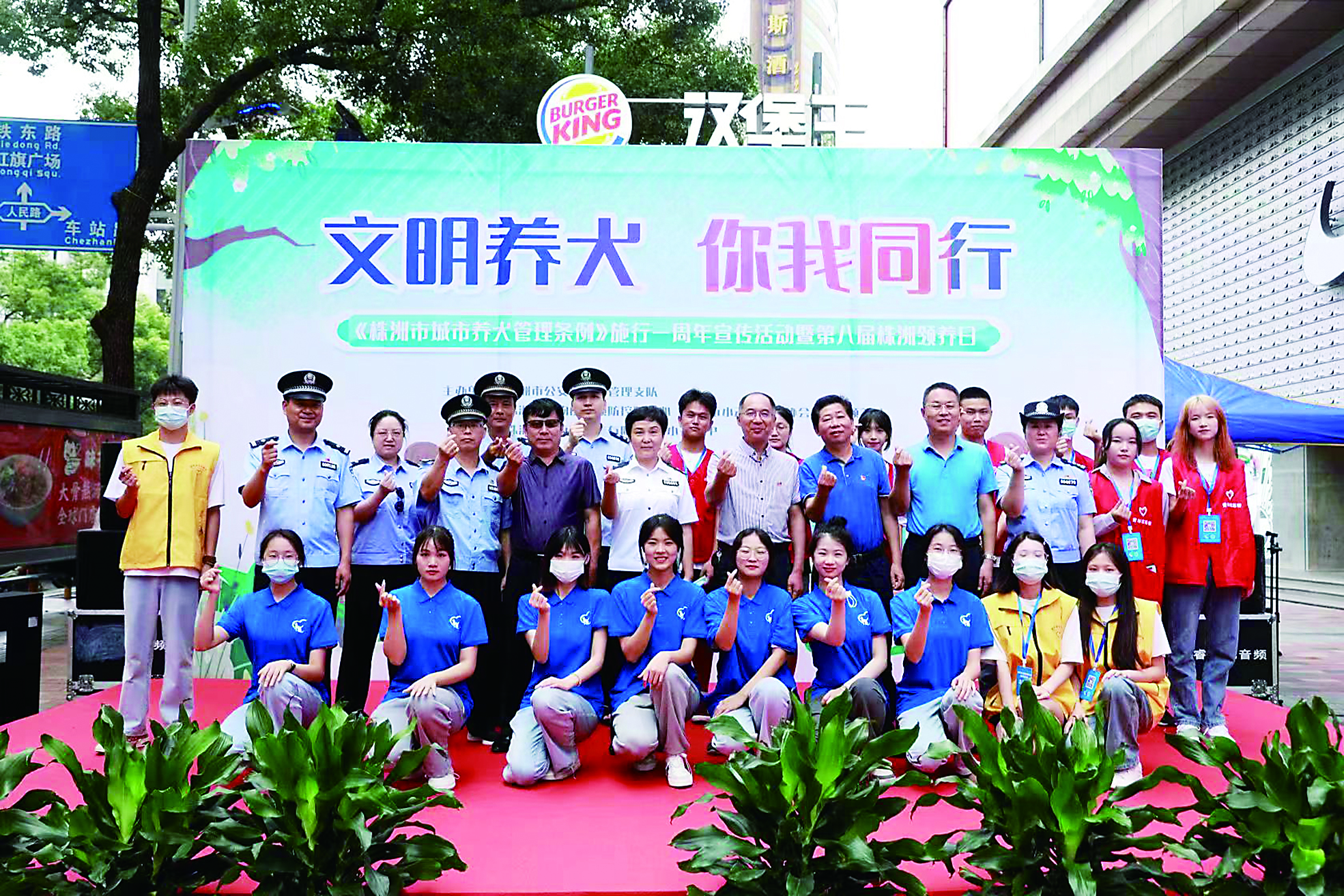 ▲6月11日,市公安局联合市农业农村局,在芦淞区王府井广场举行“《株洲市城市养犬管理条例》实施一周年暨第八届株洲领养日”大型宣传活动,营造文明、有序、安全养犬的良好氛围。民警提醒各位爱犬人士,牢记“养犬要办证,免疫必先行,外出应牵绳,犬便及时清,犬吠不扰民”。图为市公安局、市农业农村局相关工作人员及市小动物保护协会志愿者、宠物医院工作人员等在活动现场比心,宣传文明养犬。 通讯员 供图