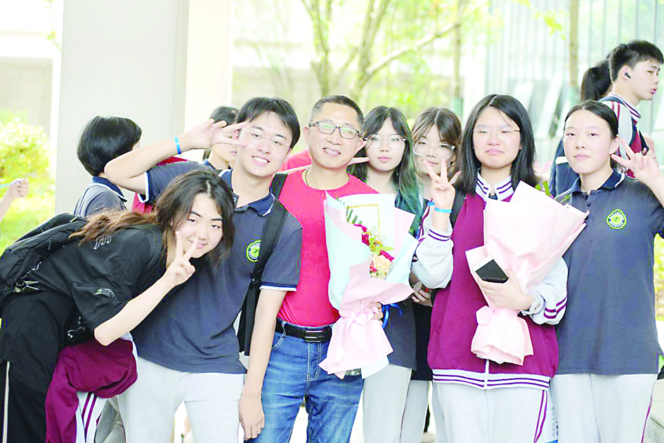 ◀同学们向恩师献花,开心合影。 通讯员供图