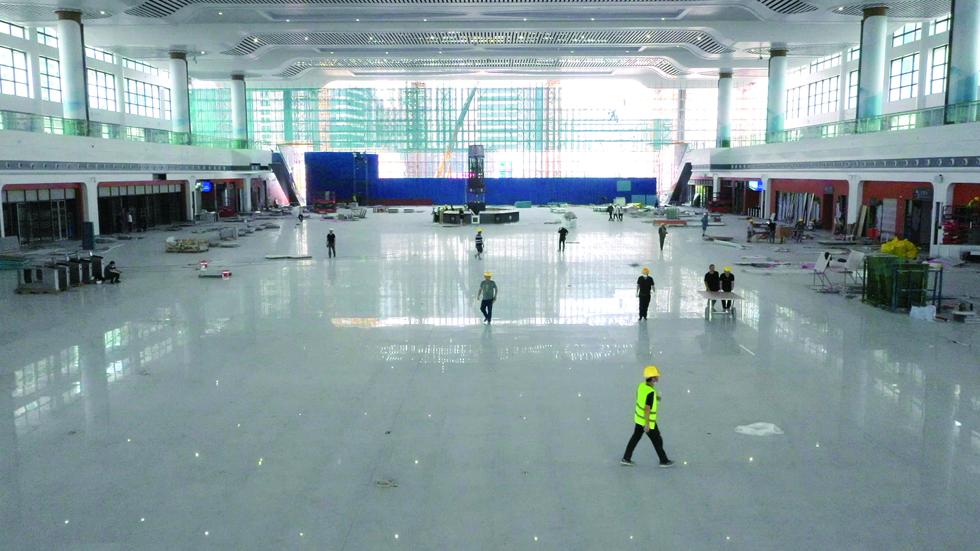 从东广场走进东站房一楼,通向二楼进站口的手扶电梯和竖梯已经全部安装到位,工作人员正在进行最后的检修和调试。二楼进站口门外的平台之上,地砖的铺装工作也已进入尾声。