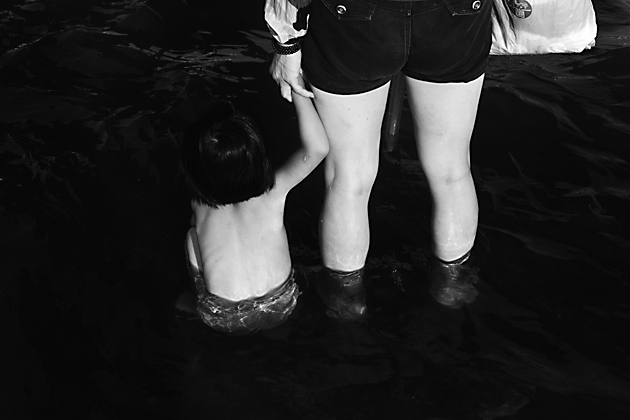⑤炎炎夏日,市民带着孩子浸泡在水中。