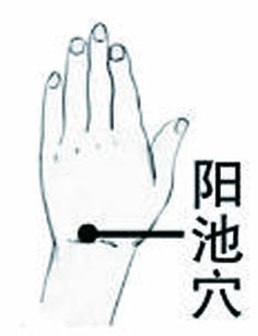合按大陵穴(腕掌横纹的中点处,当掌长肌腱与桡侧腕屈肌腱之间)、阳池穴(位于腕背横纹中)。将拇指指腹放于大陵穴,中指指腹放在阳池穴,一起用力按压1分钟。可疏通经络、滑利关节。(摘编自《大河报》)
