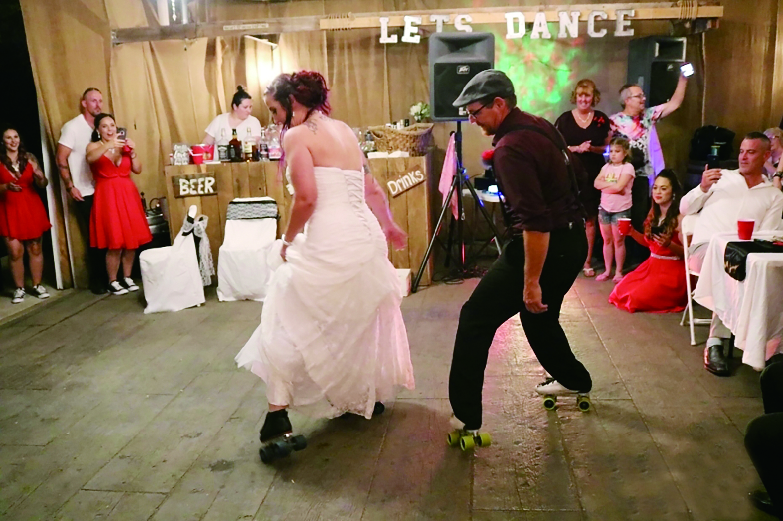 ▶新娘克丽丝·米切尔在婚礼上对新郎说完“我愿意”后,和她的父亲蒂姆·莱萨克步入舞池跳了第一支轮滑舞蹈,令前来参加婚礼的宾客们赞叹不已。
