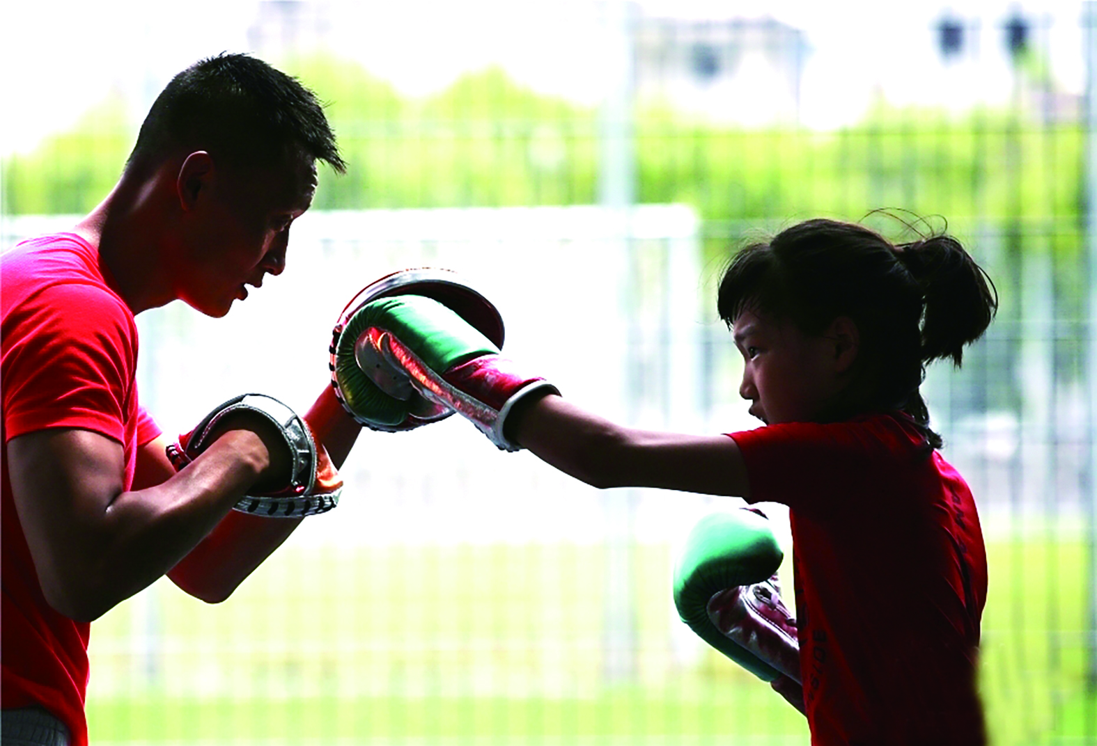 ◀王佳恩2008年出生,5岁正式接触拳击,并显露出不错的天赋。王佳恩的父亲王华是一名业余拳击手,他希望孩子在拳击之路上可以走得更远。图为在江苏昆山,爸爸王华陪女儿王佳恩练习拳击。
