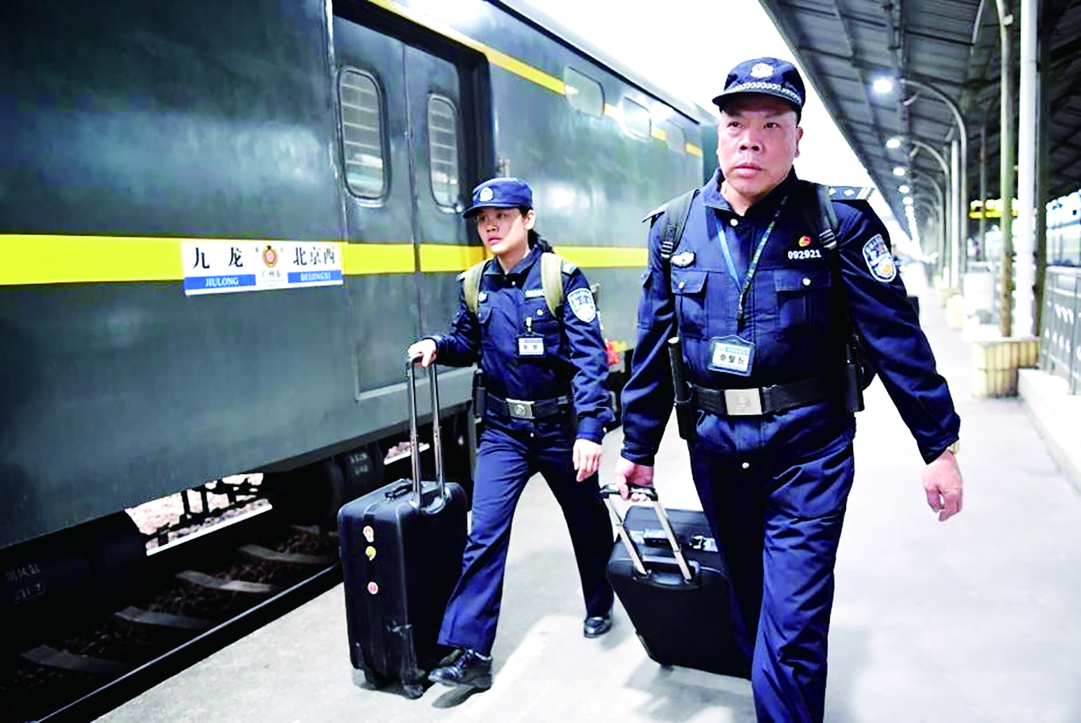 ▲老警察石雁飞带着见习警察、女儿石芷君一起工作。在乘警岗位上,父女如师徒,努力做好乘警接力跑交接棒,保一方平安。