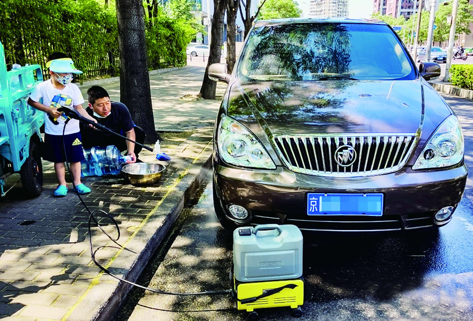 ▼一名小朋友在父亲的陪伴、指导下在北京市朝阳区望京街道路边清洗自家车辆,体验担任“洗车员”。