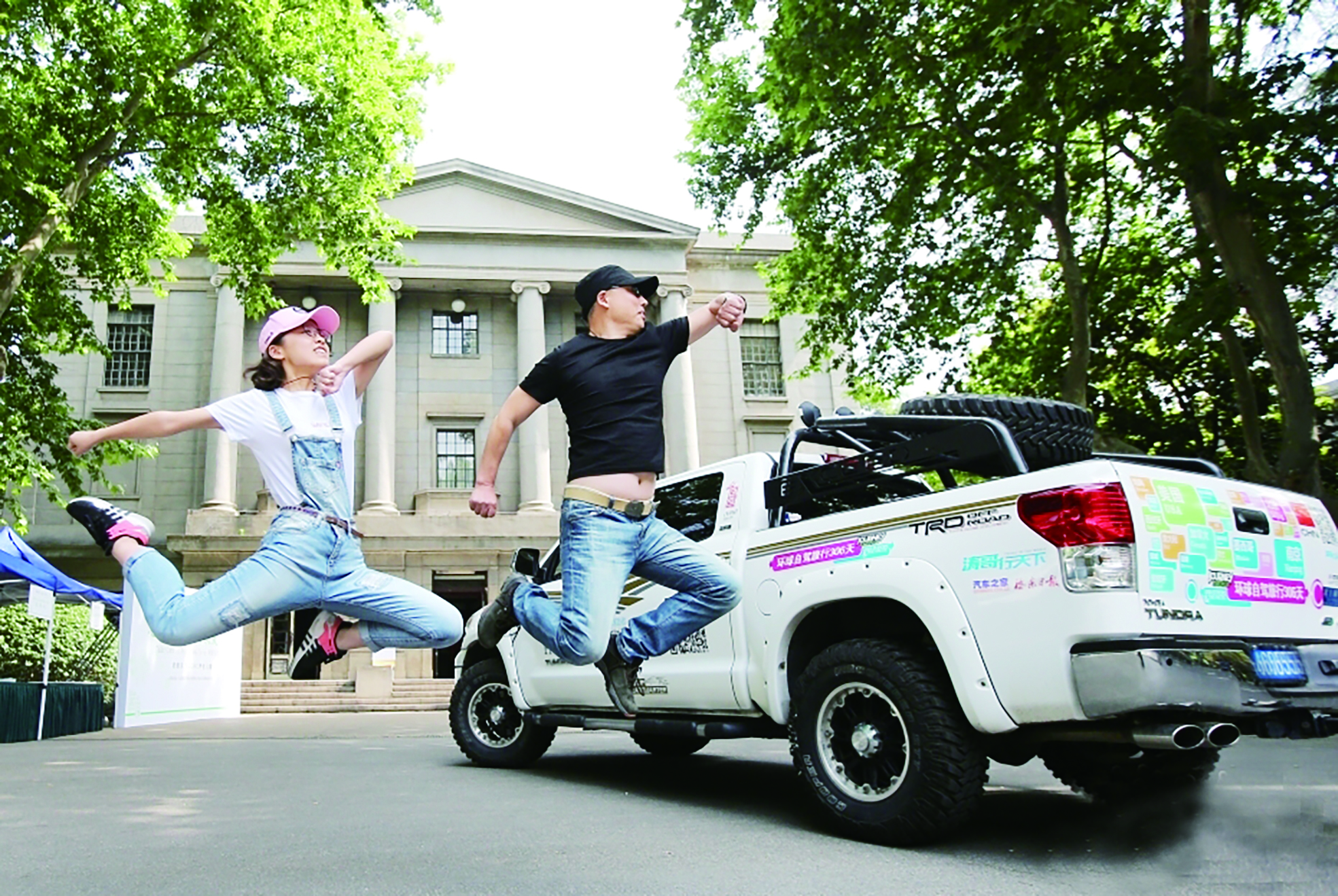 ▲黄海涛、黄歆轶父女驾驶越野车穿越52个国家,沿途拜访100所高校。图为黄海涛、黄歆轶父女首站拜访南京东南大学。