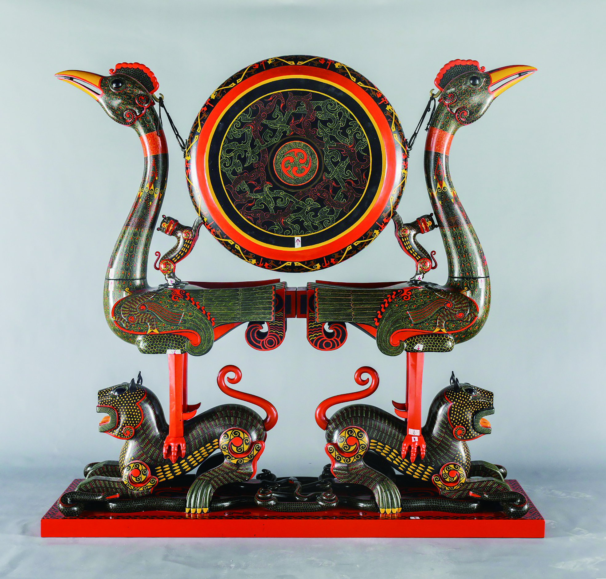 刘比建是湖北省楚式漆艺、传统古乐器制作双料传承人,从事楚式漆器修复、制作近 40 年,他复制的器物很多,有梅花鹿、鸳鸯盒、漆奁等,是“曾侯乙古瑟”等多种漆木古乐器的唯一馆藏复制件制作者。虎座鸟架鼓是战国时期楚墓中造型独特的漆器,也是楚文化的典型代表物。这件《九连墩虎座鸟架鼓》的设计可谓巧夺天工。一对昂首相背踞状,尾不相连的大老虎匍匐于六蛇纠结的浮雕底座之上,虎座大而底平,使整个鼓的重心非常稳;一对前腿箍住鼓框的小老虎支撑鼓身,这样设计能在击鼓时减少震动。两只凤鸟立于大虎背上,鸟头与虎头同向,鸟尾相连,木鼓悬挂双鸟之间,鼓绳扣于鸟冠上。虎斑凤羽和装饰花纹以红黄黑三色为主,绘画线条流畅,形象逼真,栩栩如生。在夸张的虎座鸟架雕像暗示之下,听者的感觉已然移入到似有“虎啸凤鸣”的境界。作品造型别致典雅,设计巧妙,融声、色、形于一体,表现出楚人绝妙的想象力和高超的艺术表现力。