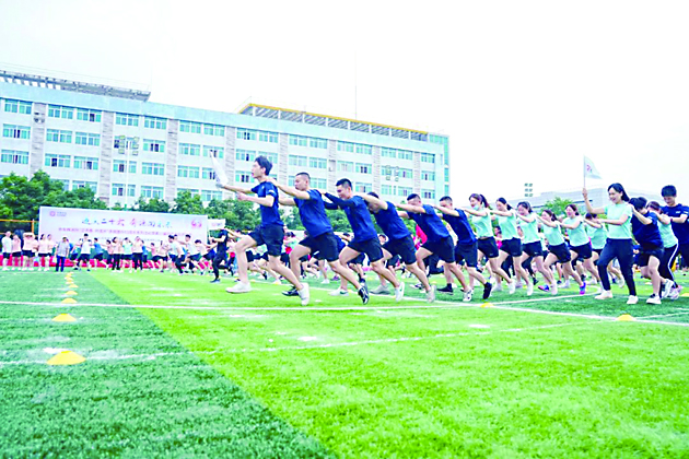 活力似火燃烧,青春如花绽放。在中车株洲所第十一届员工大众运动会上,队员们随着响亮的口号,步伐一致冲向终点。(“中车株洲所”供图)
