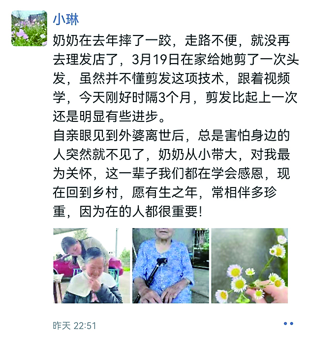 奶奶去年摔了一跤,走路不便,就没去过理发店了。3月19日,我在家给她剪了一次头发。我不懂剪发这项技术,跟着视频边学边剪。到今天过了3个月,再次给奶奶剪头发,我的技术比上次有了明显进步。