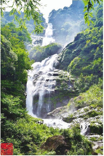 在神农谷田心里,一群一群的人沿着桃花溪岸边的山道往深处行走,面前这道大山谷就是东坑。桃花溪本身就十分吸引人们的眼球了,溪河里乱石峥嵘,溪流奔腾跳荡,时而飞花溅玉,时而碧潭涌珠。两岸绿树荫翳,竹木交会,或峭岩陡峻,或滩涂茵苔,清风徐徐,清爽宜人。但是,人们却不愿意停下脚步,仍然一个劲地往前疾行。因为前面有一道飞泻两百三十多米的大瀑布——东坑瀑布。