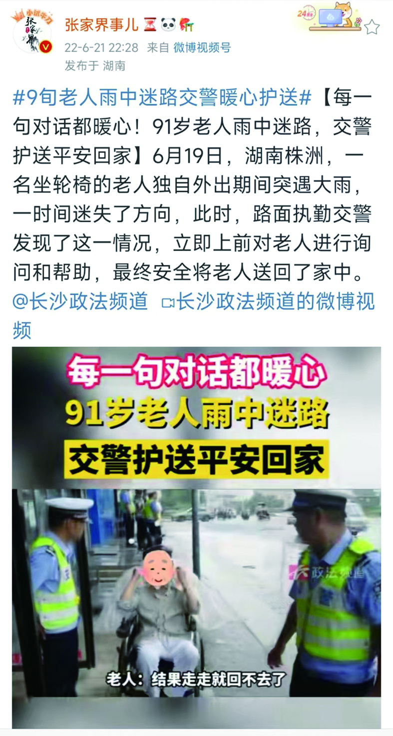 6月19日,湖南株洲,一名坐轮椅的老人独自外出期间突遇大雨,一时间迷失了方向,此时,路面执勤交警发现了这一情况,立即上前对老人进行询问和帮助,最终安全将老人送回了家中。