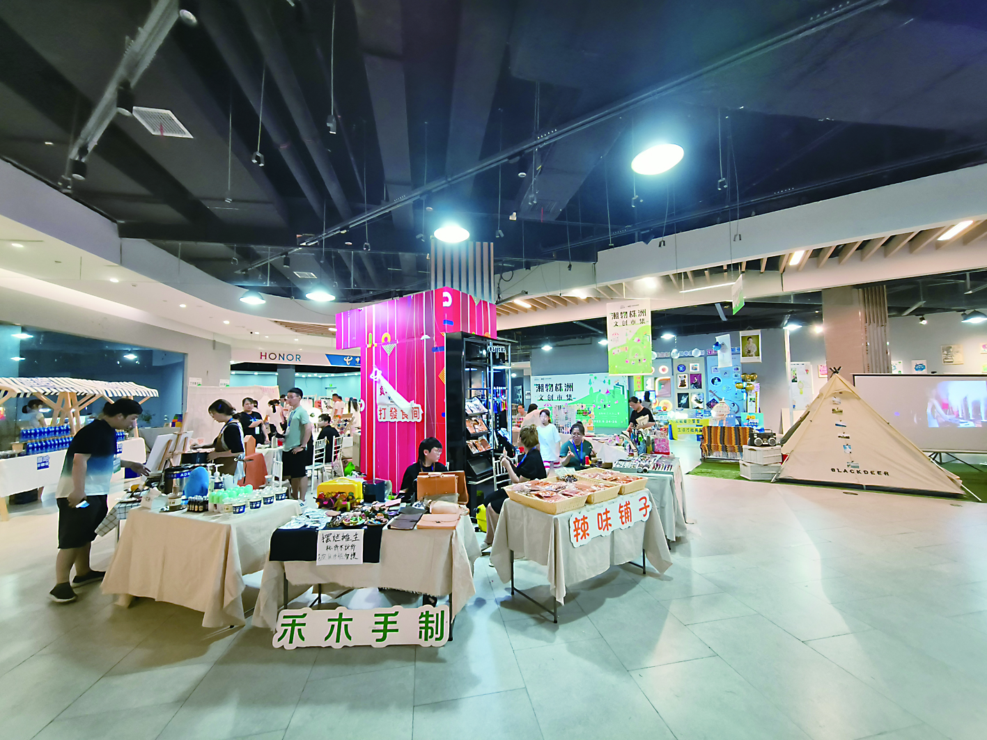 6月24日晚,潮物株洲·文创市集在天元区步步高广场负一楼又开市了。此次市集规模更大、场地更大、参展品牌更多,除了62家各类商家展示以外,还有青年合唱团声乐表演、艺芳轩进行行茶八式表演、回声音乐青年演出团阿卡贝拉演出等活动。市集将持续至6月26日。