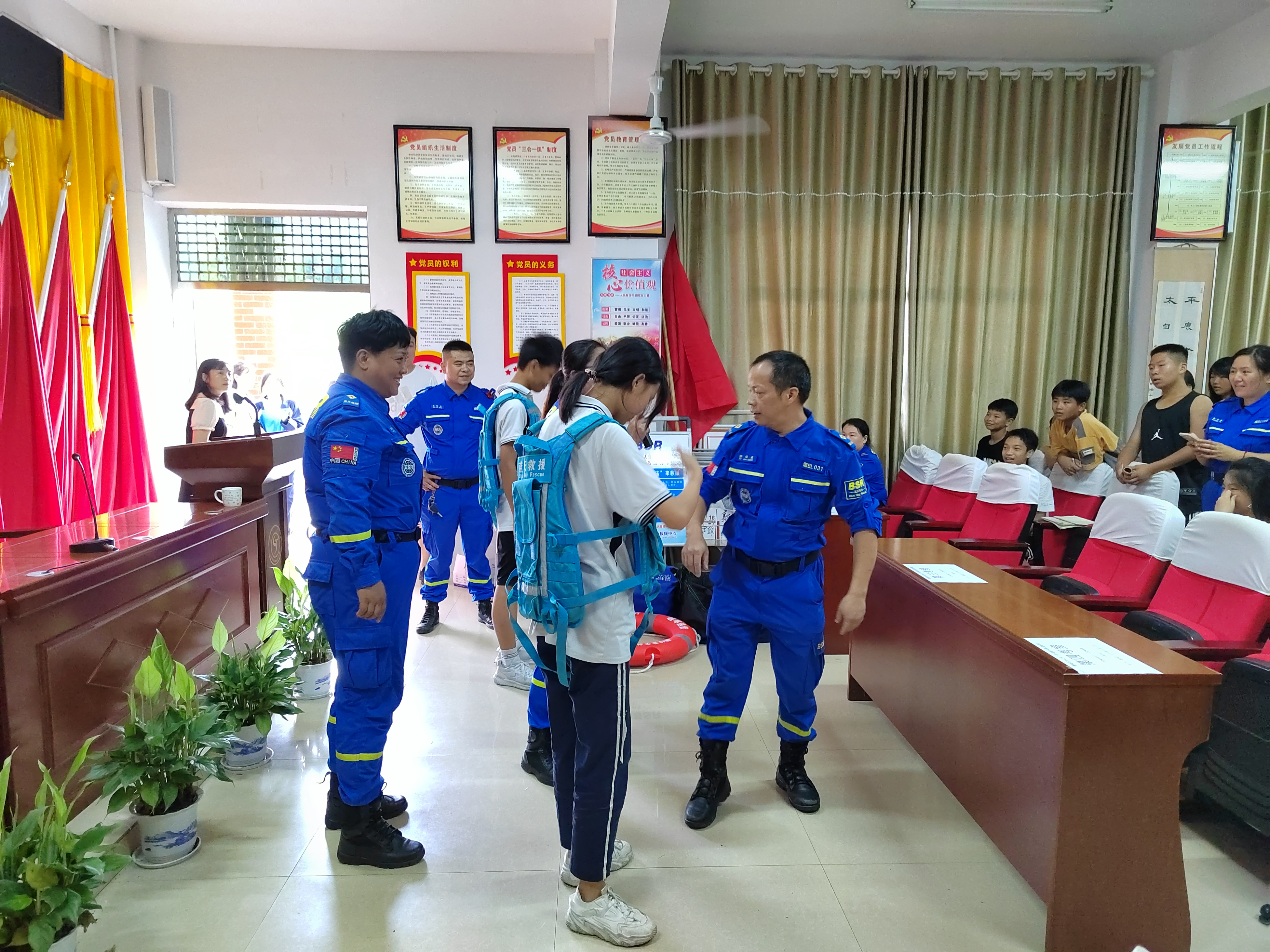 在石亭中学,蓝天救援队队员结合生活中的实际案例,通过讲述发生在身边的溺水事件,播放防溺水安全警示片等方式,使学生们切身感受到水边玩耍的危险性,同时还利用各种道具,向同学们展示自救和施救的方法。为了加深学生们对防溺水知识的了解,救援队员采用互动问答、现场演示等方式,让学生们参与其中,使同学们在轻松愉悦的氛围中,学习掌握防溺水知识。