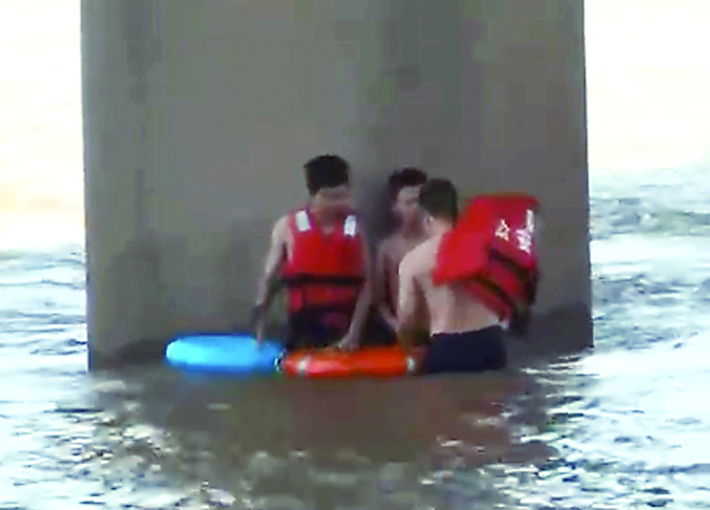 快艇在桥墩附近绕行多圈,仍一直无法停靠,只能抛下一条长绳。水警将绳子的一头系住游泳圈,另一头则交给岸边的群众。在确定绳索稳定后,三人这才抱住游泳圈陆续“下水”往岸边游。