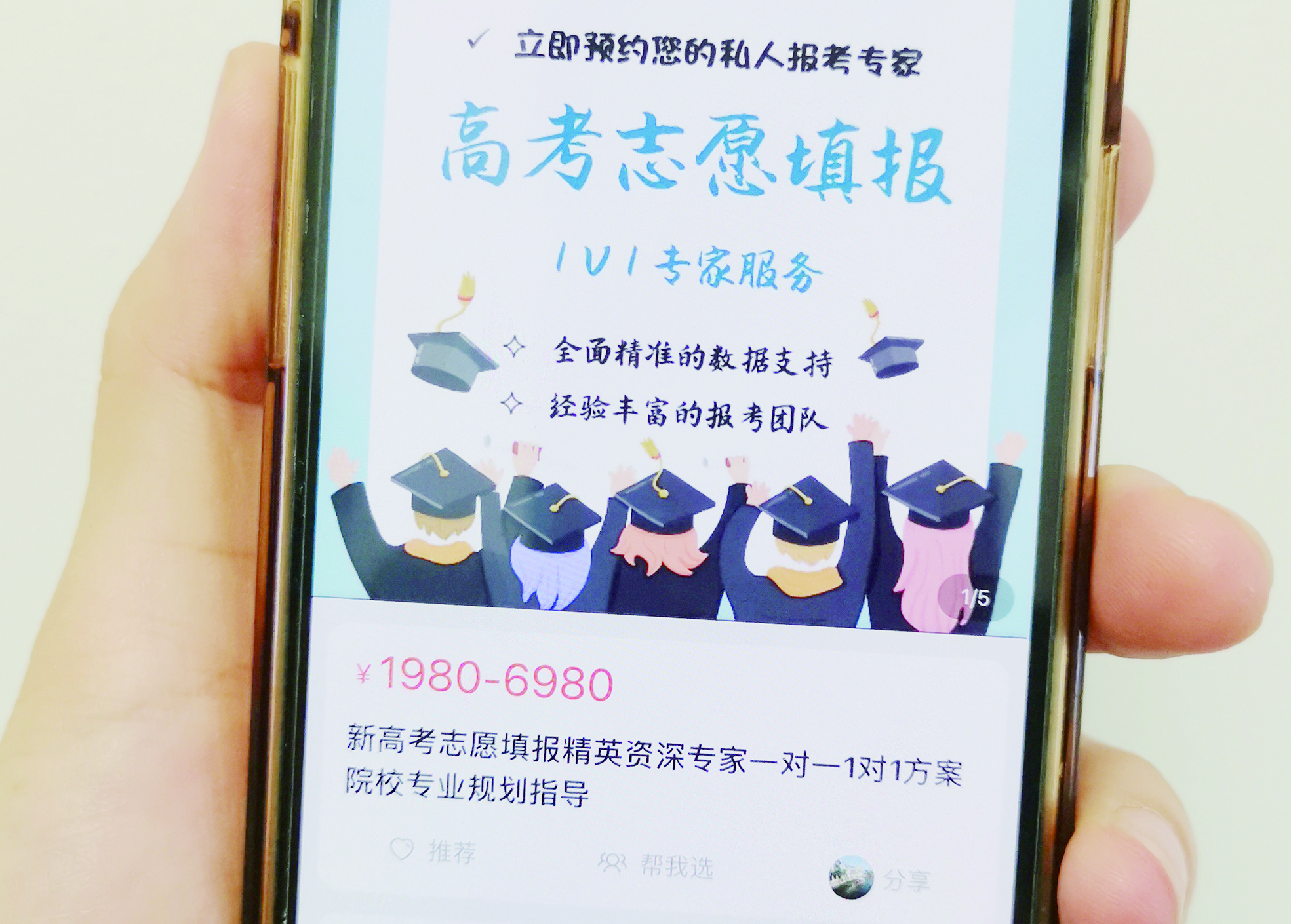 其中一款“志愿填报智能大数据平台”的服务价格大约300元,广告宣称涵盖近年来千所大学的录取数据,可以智能推荐学校。一对一人工指导服务的价格则要高很多,从数千元到万元以上,内容包括多次线上线下咨询,以及所谓的“资深高考规划师”为考生提供多组志愿填报方案等。