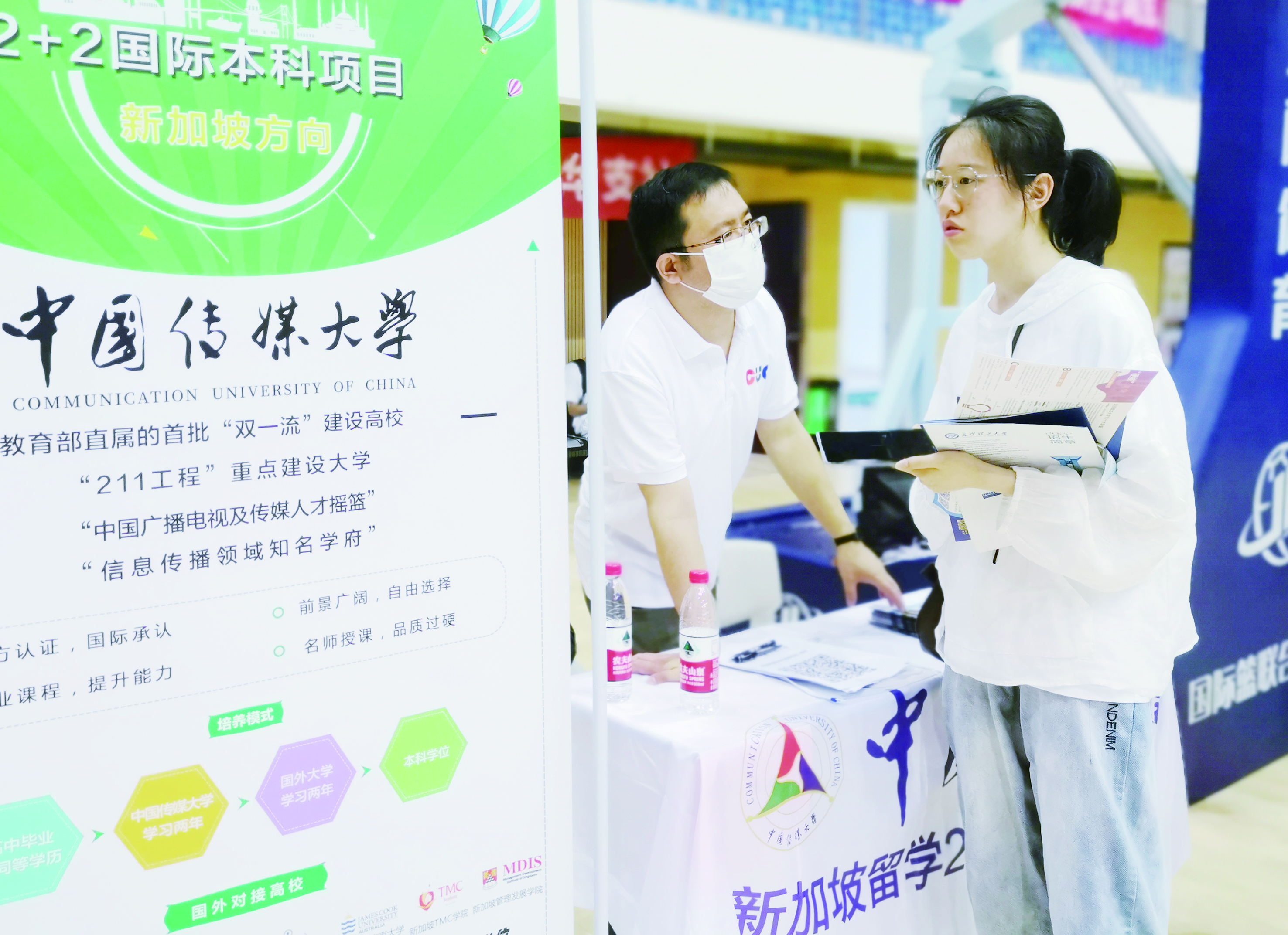 ▲一名考生与招生代表咨询相关条件和要求。 记者/戴凛 摄
