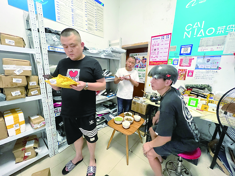 ◀客户来取快递,汤斌(左)再次放下筷子。记者/张威 摄
