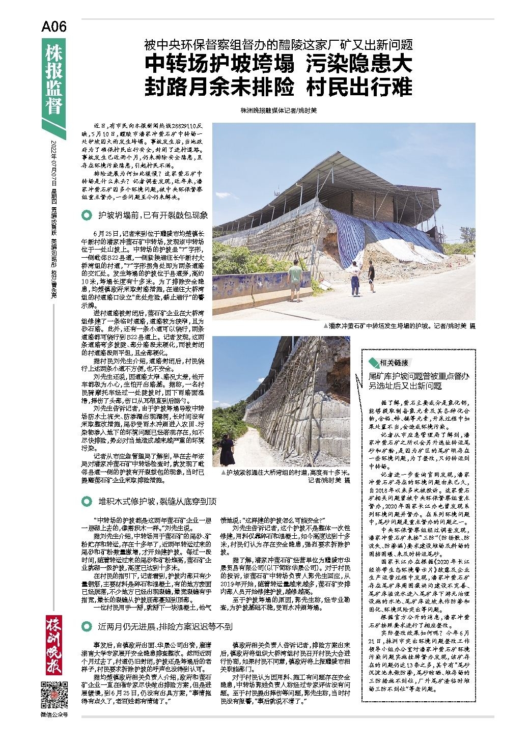 中转场护坡垮塌 污染隐患大 封路月余未排险 村民出行难