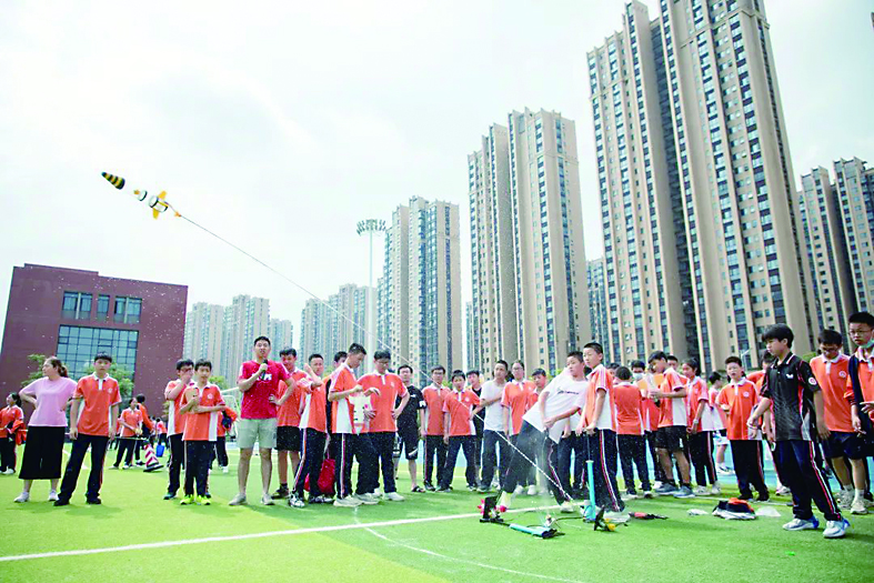 在九宫格的数独盘面进行演算推理,迸发思维的火花。众多“数独迷”5人一组,享受数字的魅力,展现自我风采。橡筋动力飞机留时赛,同学们自制飞机,以飞机停留时间长短决一胜负。吹硬币比赛,用嘴吹气到预定位置,了解伯努利原理。用可乐瓶自制火箭模型,往里面注水,然后打进空气,水往后喷的过程中,会给火箭模型一个向上的推力,从而发射出去,让大家认识牛顿第三定律。学生们在快乐的氛围里学习科技知识,学校则持续践行“双减”,回归教育本质。