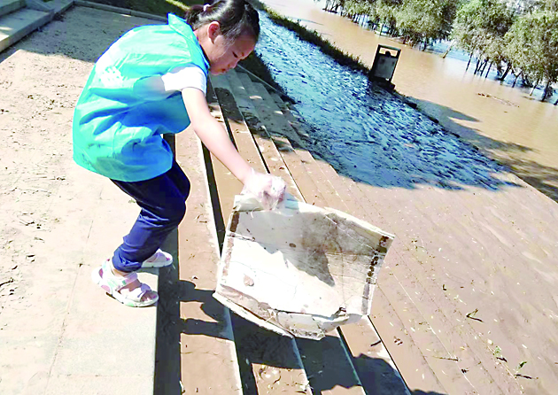 如今,曹诗蕊在银海小学就读二年级。见到曹诗蕊时,她正在参加“为母亲河净滩”活动。尽管她的手臂和脸蛋已经晒得有些发红,河滩因退水而泥泞不堪,但她却并不在意,依旧冒着毒辣的阳光,在河边捡拾垃圾。不一会儿,她手中的垃圾袋就装得满满的。