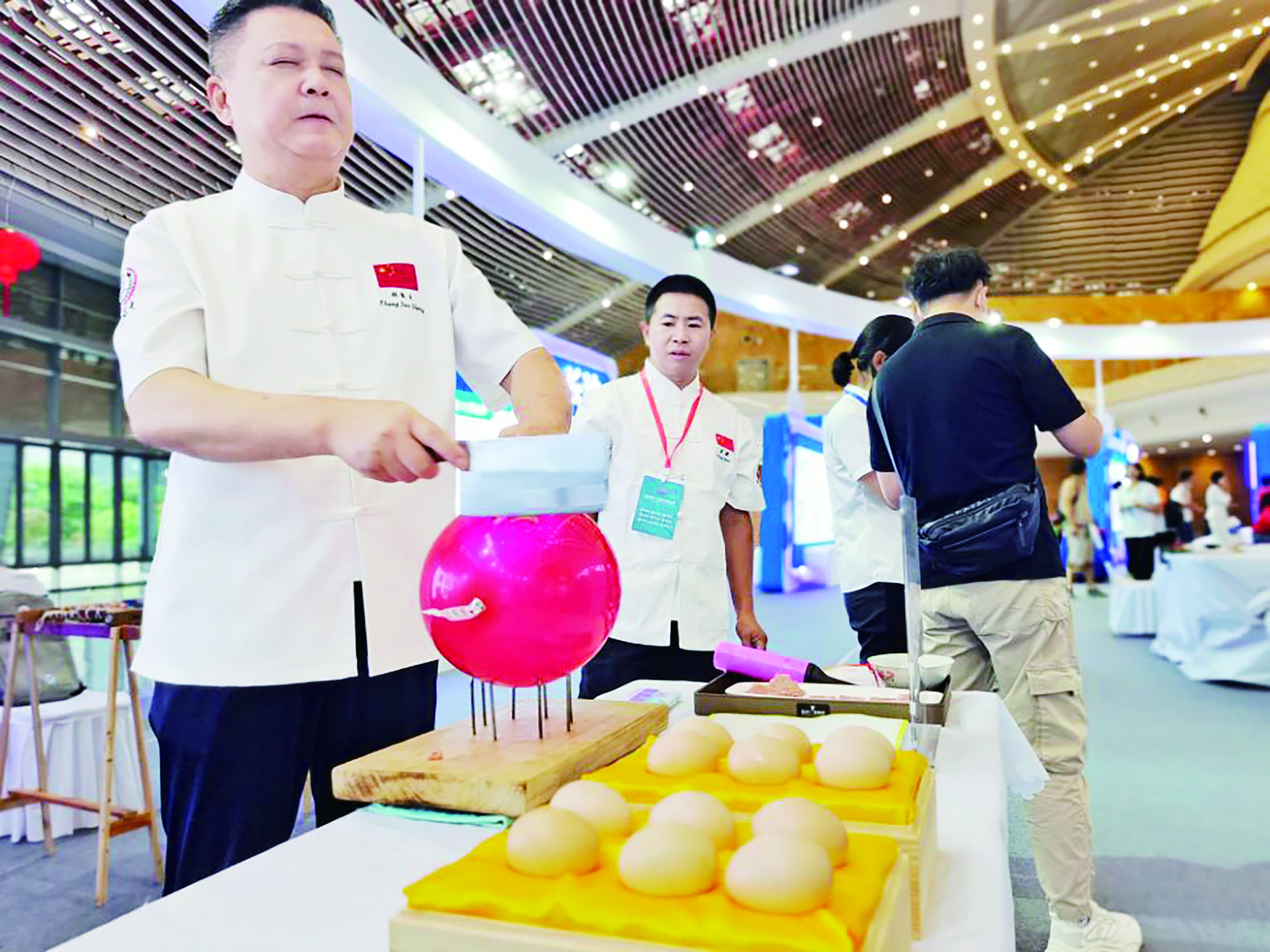 ▲昨天,在全省第一届职业技能竞赛绝技绝活展演现场,中国烹饪大师、湘菜大师张竣生表演“蒙眼气球切肉丝”,只见他脚踩鸡蛋,在气球上切肉丝,而气球却放在8根锋利的铁钉上,几十秒内切肉成丝,让人大开眼界。 株洲晚报融媒体记者/何春林 摄影报道