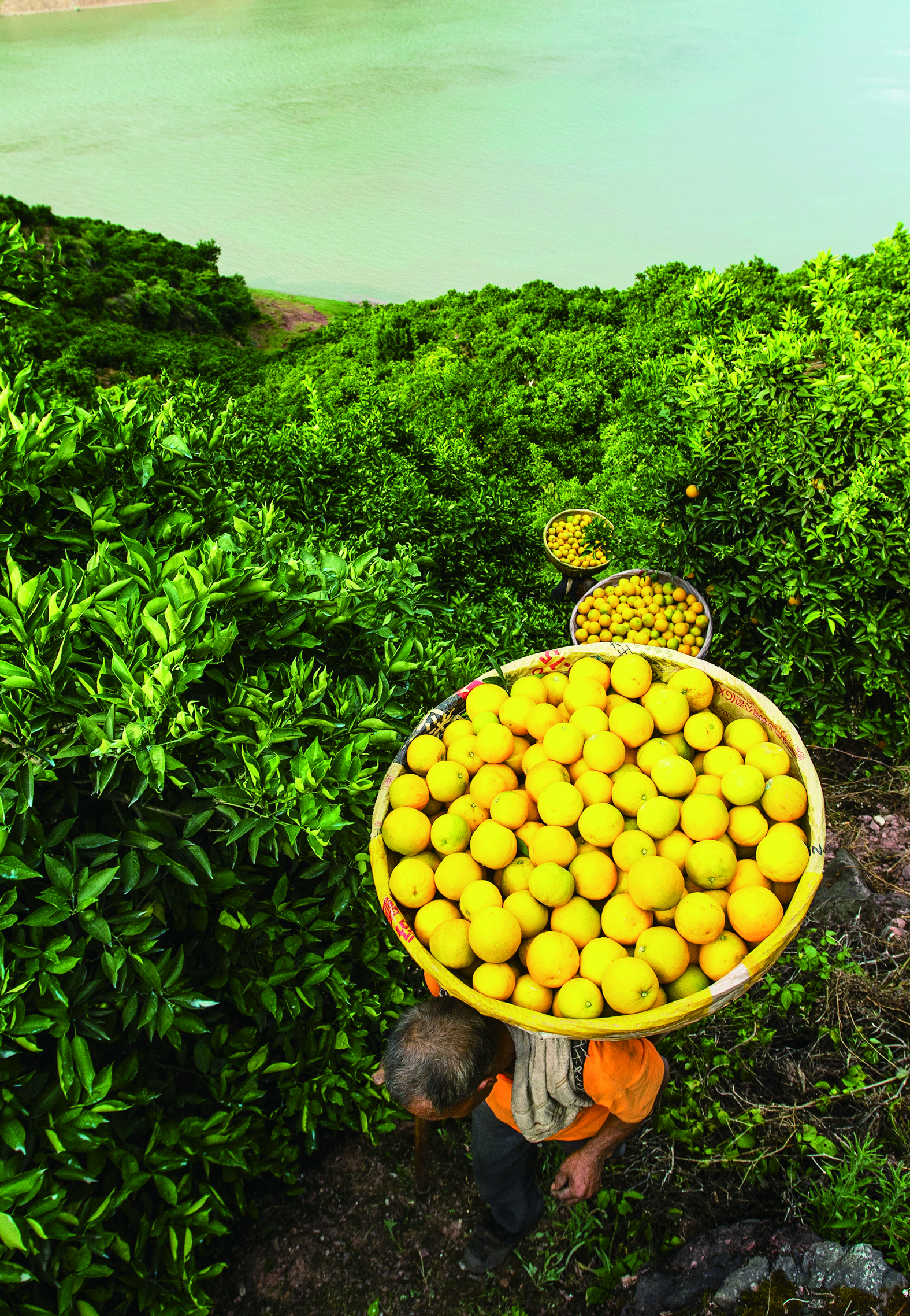 ▲6月21日,湖北省宜昌市秭归县沙镇溪镇台子湾村村民在柑橘园里转运夏橙。