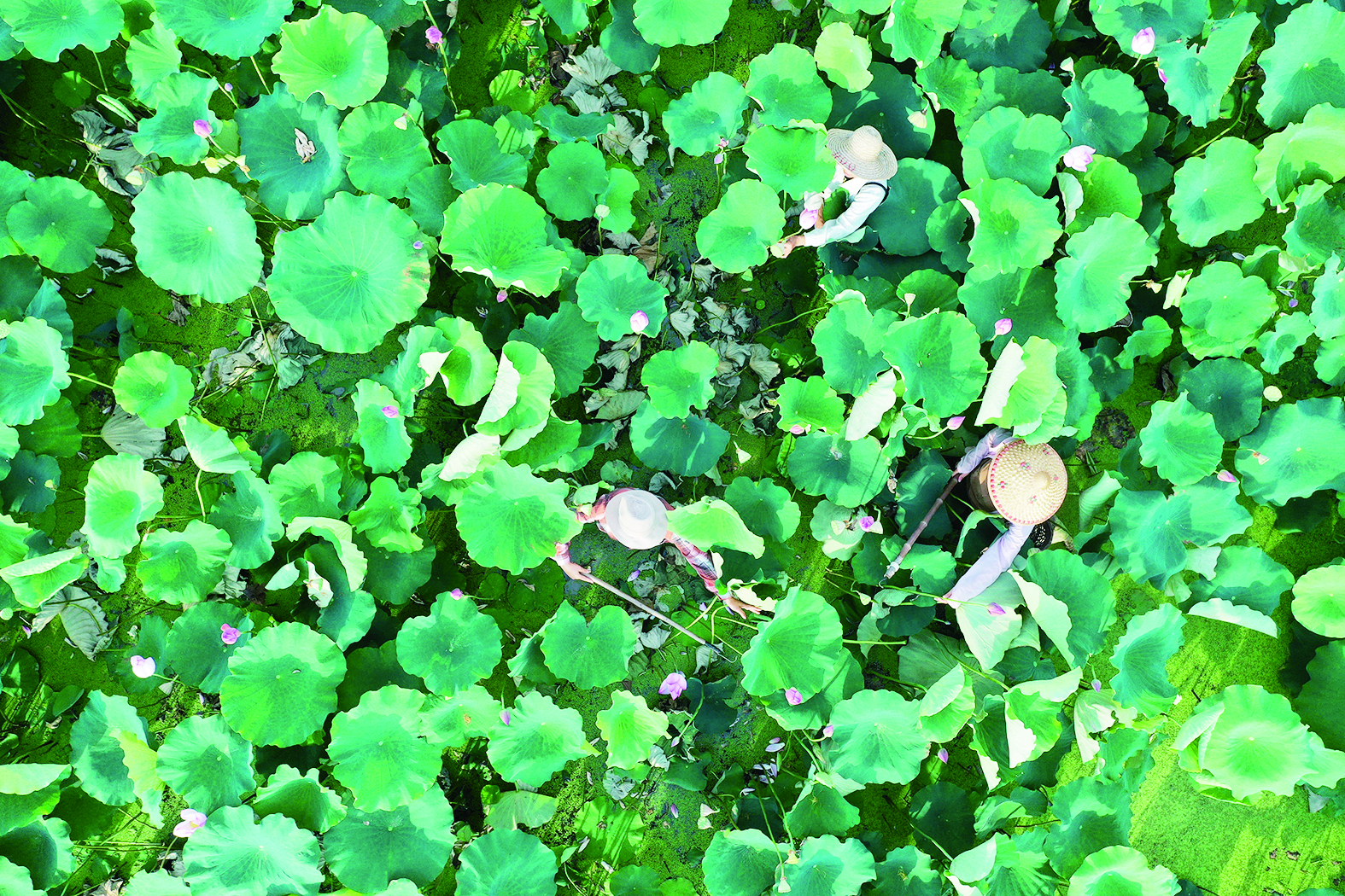 ▲6月29日,浙江省建德市大慈岩镇里叶村的莲农们在荷田里采摘荷花和莲蓬(无人机照片)。