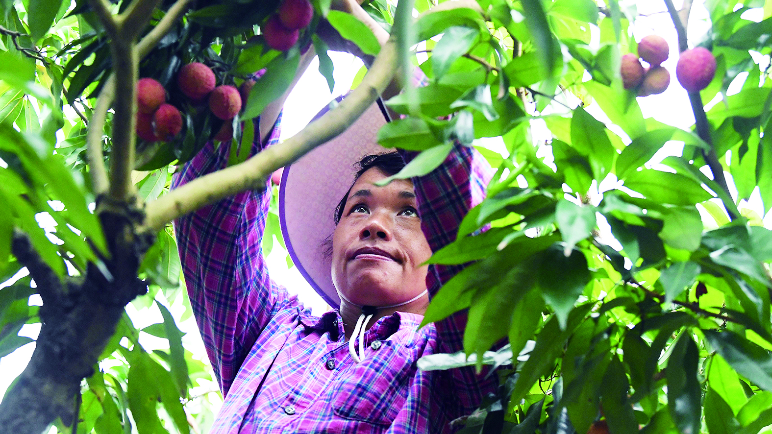▲6月29日,在广西钦州市钦南区沙埠镇杨梅村荔枝园,一名村民在采摘荔枝。