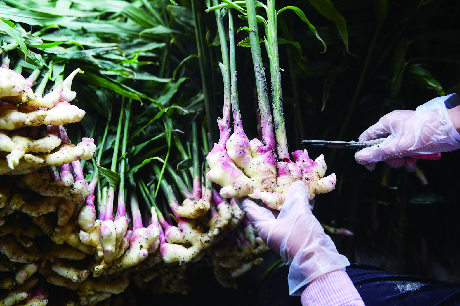 ▲6月21日,在浙江省嘉兴市南湖区新丰镇净相村生姜种植户陈建根的基地内,工作人员在分拣当天收获的生姜。