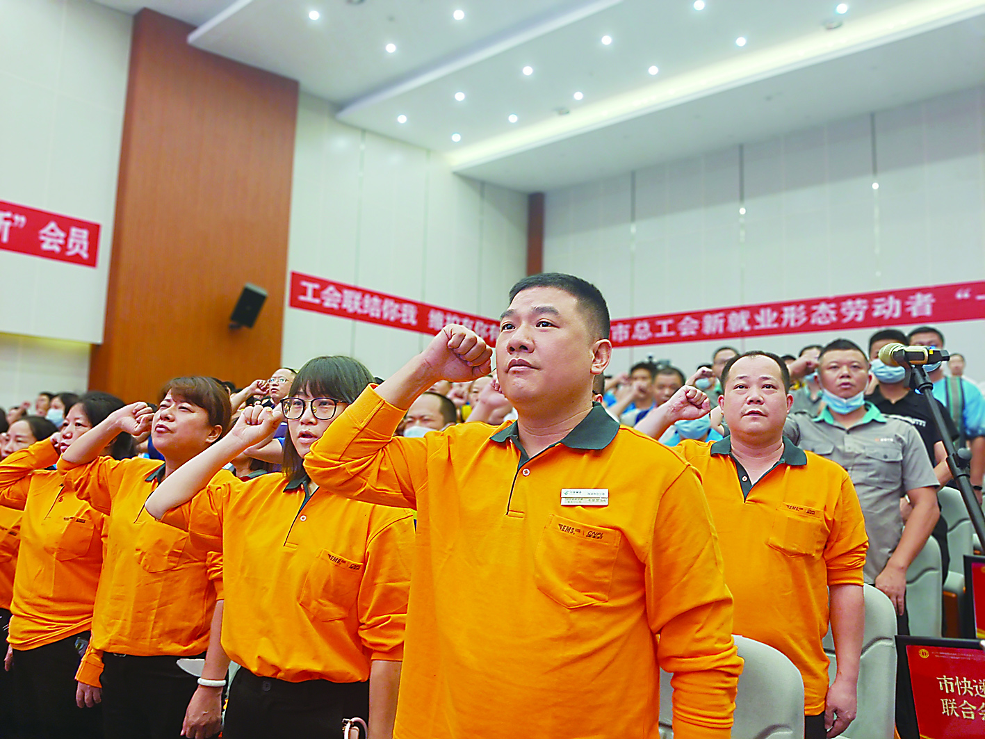 ▲昨天上午,部分新就业形态劳动者宣誓加入工会组织。记者/何春林 摄
