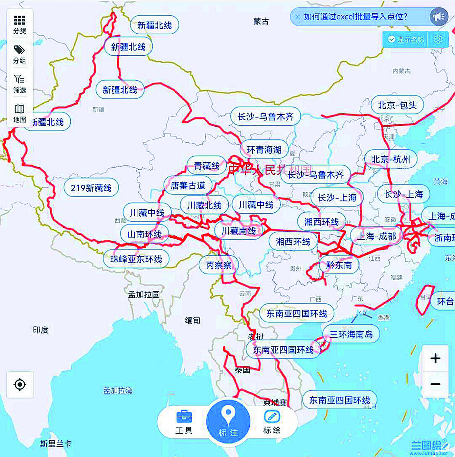 ▶十年来,宾国旭的骑行轨迹(红色标线)。受访者供图